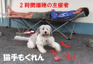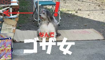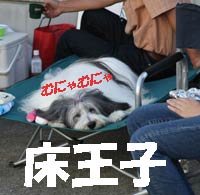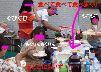 アメリカンサイズケーキ・ピザ・サラダおにぎり・稲荷ずし等が所狭しとテーブルに並び、シェフ・ジンジャー (クッキーパパ)が「焼き加減はミディアム?レア?」とステーキを焼いてくれた午後。 犬にも人間にも大好評だったのはBBQサツマイモ。 参加者A : とにかく食べて食べて食べまくりよ〜。 事務局 : 写真とって来てくれたんでしょうね? 参加者A : ・・・・・・。 参加者B : ・・・・・・。 事務局 : まじに撮ってないの? 参加者C : あっ、こんな写真があった! |